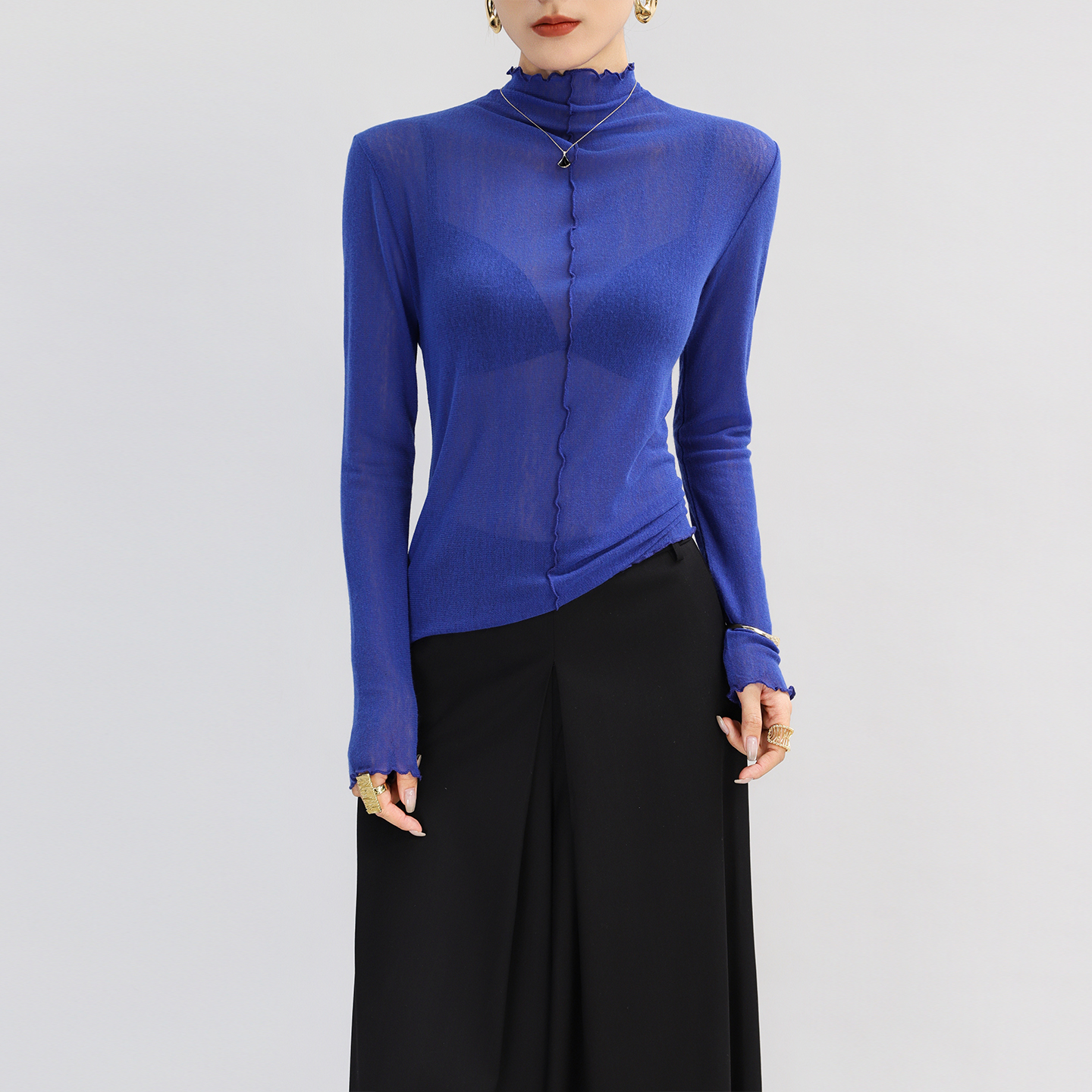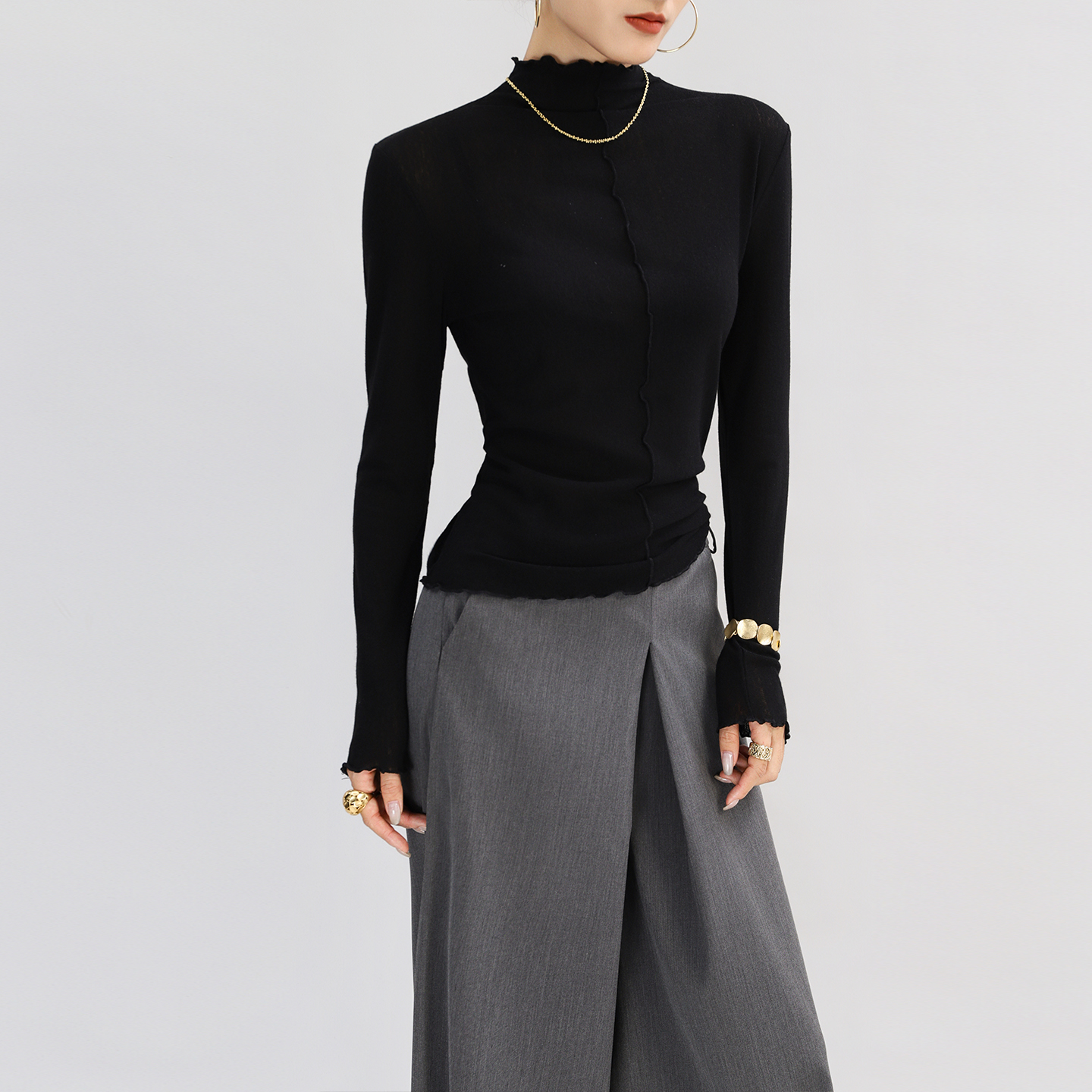 洋气纯欲木耳边上衣轻奢高级感薄 修身 灰色半高领打底衫 女内搭长袖