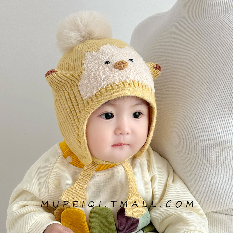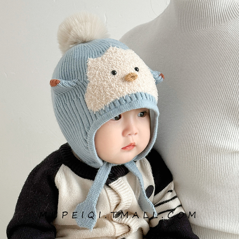 婴儿帽子秋冬季 毛球可爱小鸡护耳帽针织冬保暖 男女宝宝毛线帽韩版