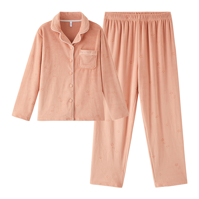 大码 春秋开衫 女士家居服 加厚珊瑚绒睡衣女冬法兰绒加绒套装 秋冬季