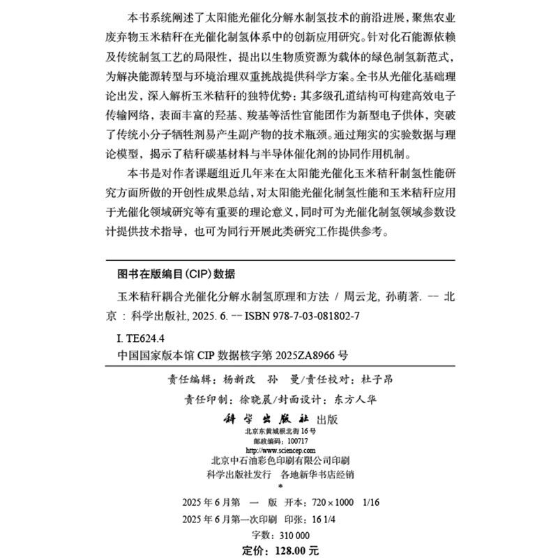 玉米秸秆耦合光催化分解水制氢原理和方法 周云龙 孙萌 社 包邮 科学出版 9787030818027 正版