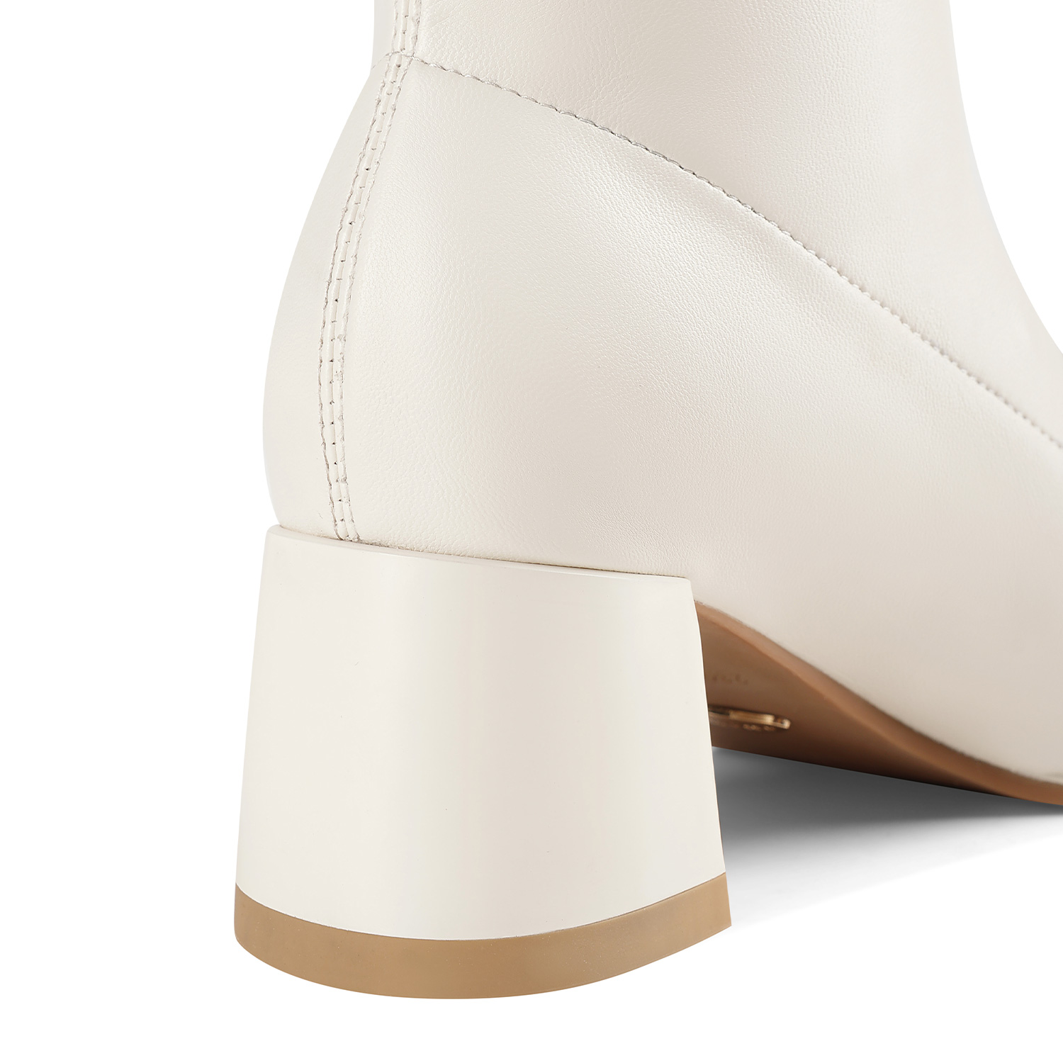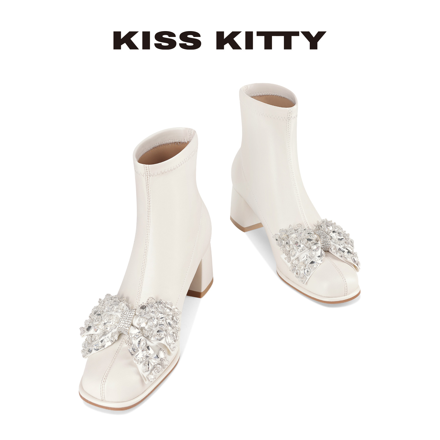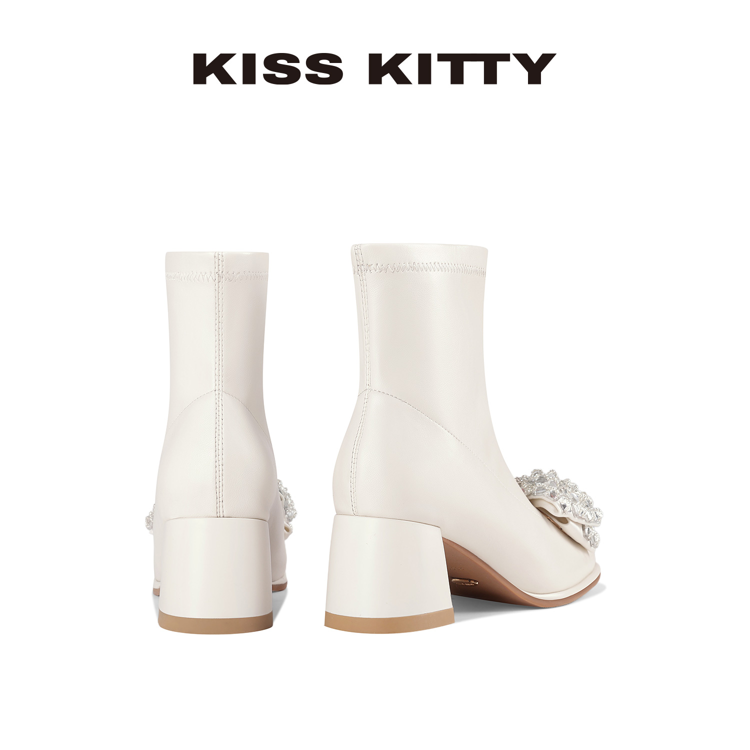 KISSKITTY法式 粗跟百搭瘦瘦靴 白色水钻烟筒短靴女2025秋冬新款