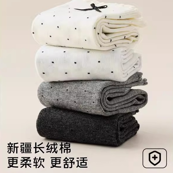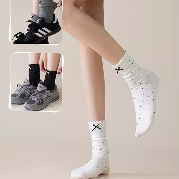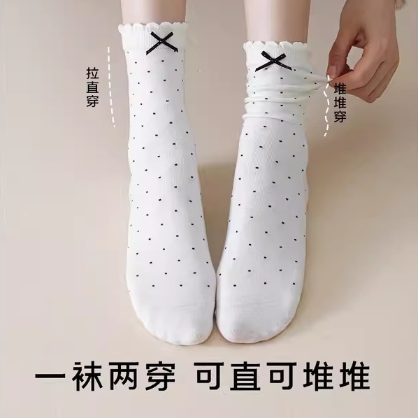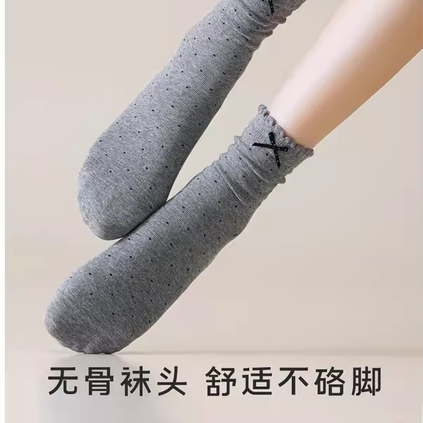 花边袜子女秋冬中筒袜纯棉纱线无骨透气波点蝴蝶结女士灰色堆堆袜
