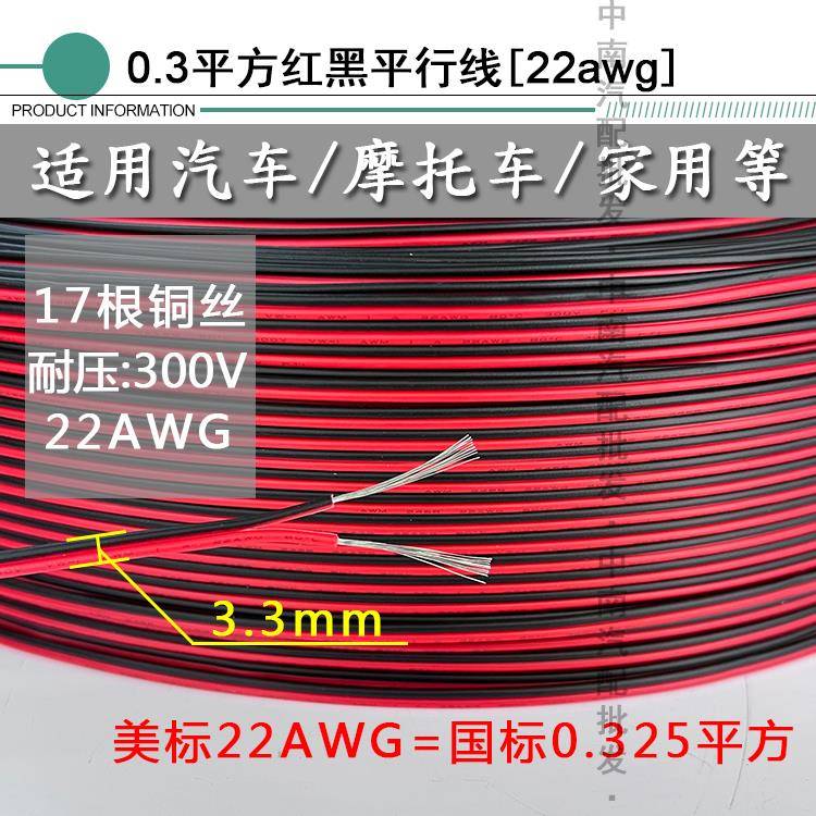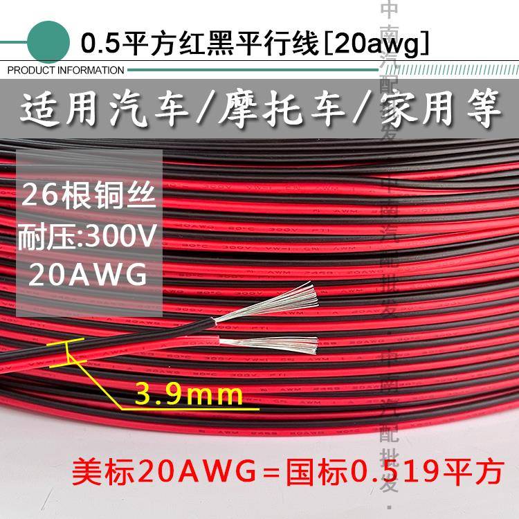 2芯汽车改装 24V 电线电源镀锡 0.5平方12V 红黑双并线纯铜双线0.3