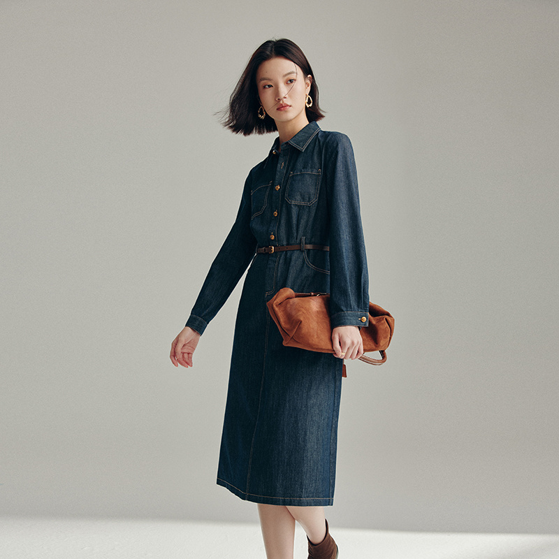 OCHIRLY欧时力 天丝不对称褶饰针织连衣裙收腰长裙2025秋冬新品