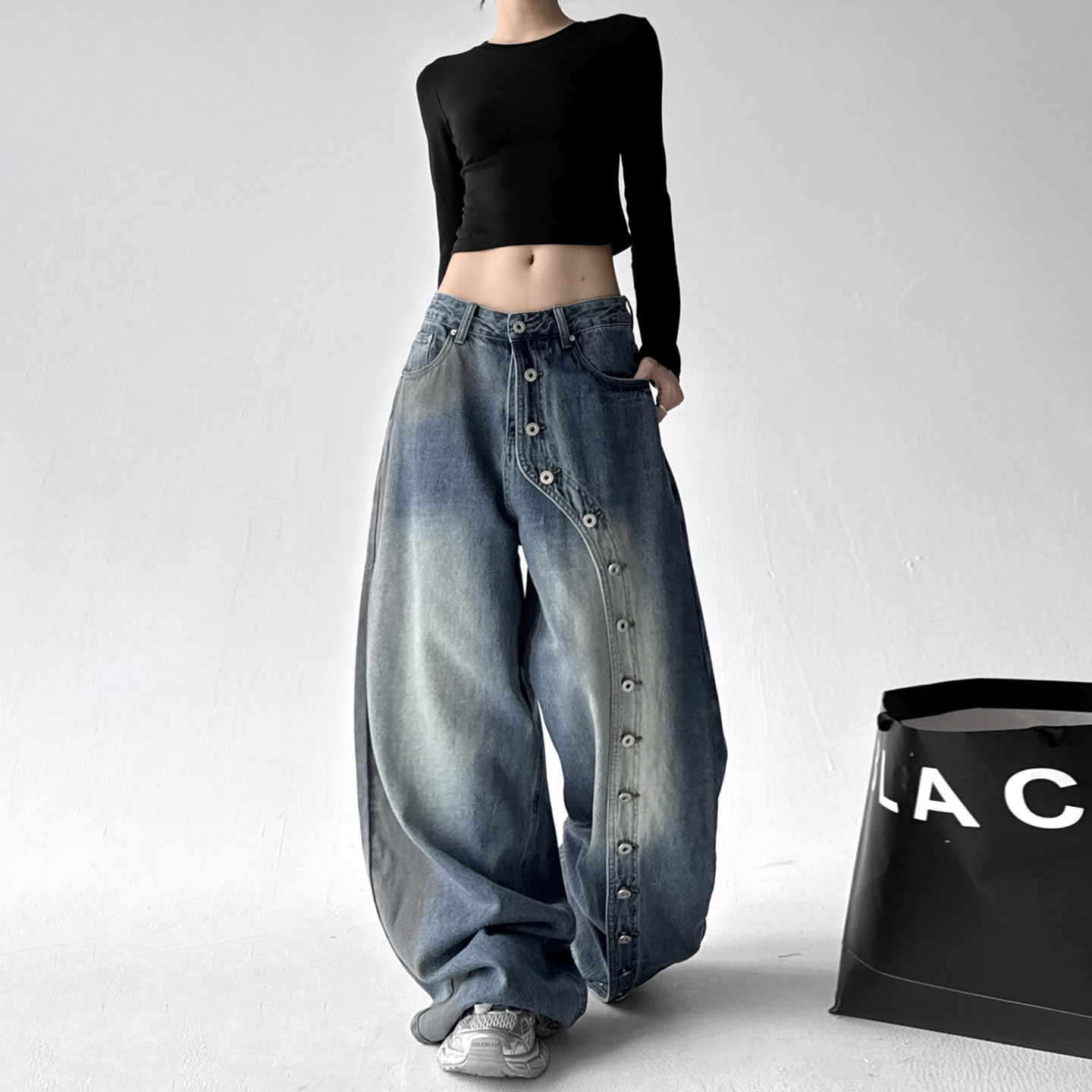 子潮 高腰铆钉宽松不贴腿垂感拖地裤 潮牌街舞阔腿牛仔裤 女2025新款