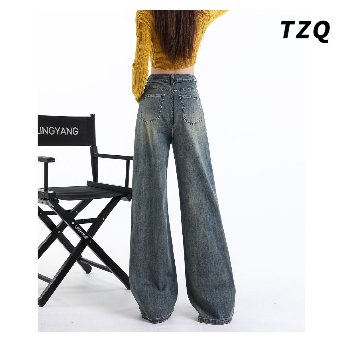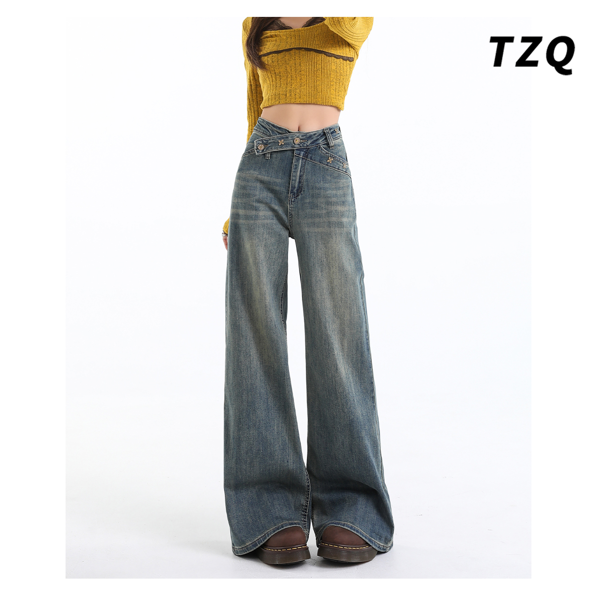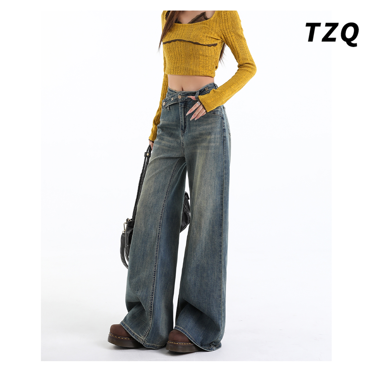复古宽松高腰拖地直筒裤 交叉腰设计阔腿牛仔裤 美式 新款 女2025秋季
