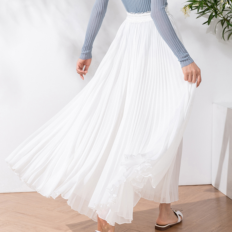 梨形百褶伞裙 优雅长款 LYNEE气质雪纺纱裙 白色大裙摆半身裙女秋季