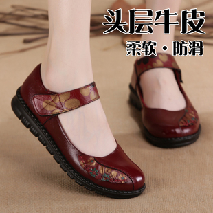柔软舒适平底鞋 春季 防滑中年妈妈鞋 牛皮软底真皮女皮鞋 闰月单鞋