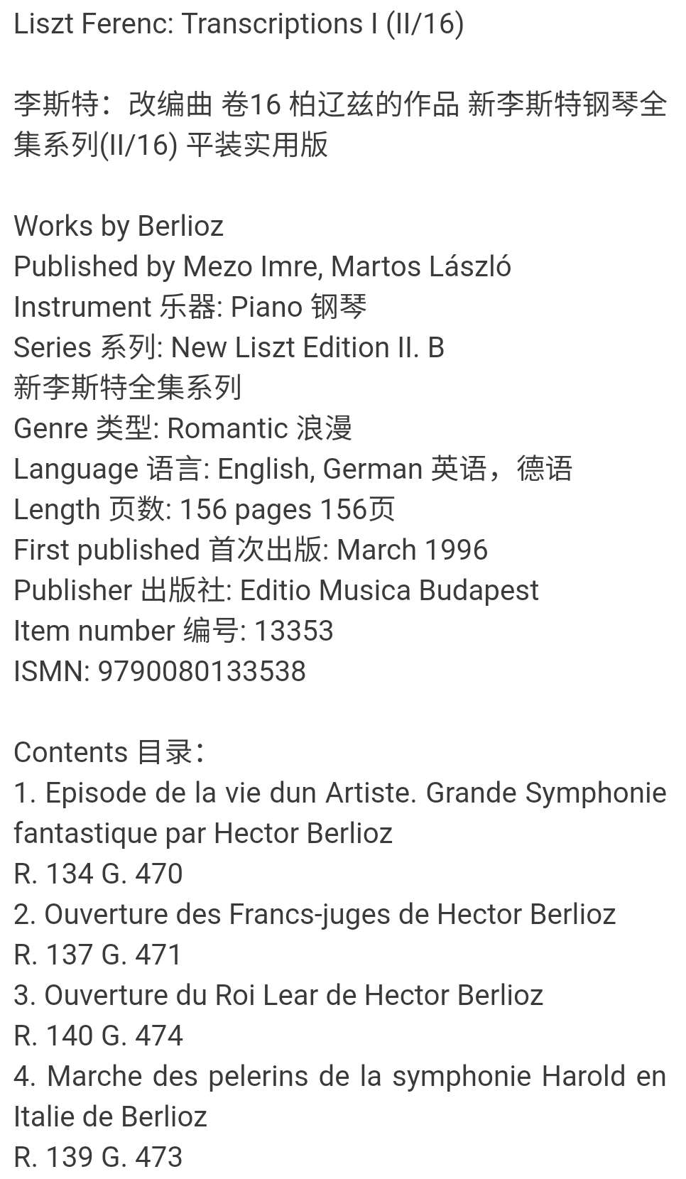 李斯特 Liszt Ferenc Transcriptions 作品 布达佩斯原版 13353 Piano 柏辽兹 新全集系列 乐谱 for 卷16 钢琴改编曲1