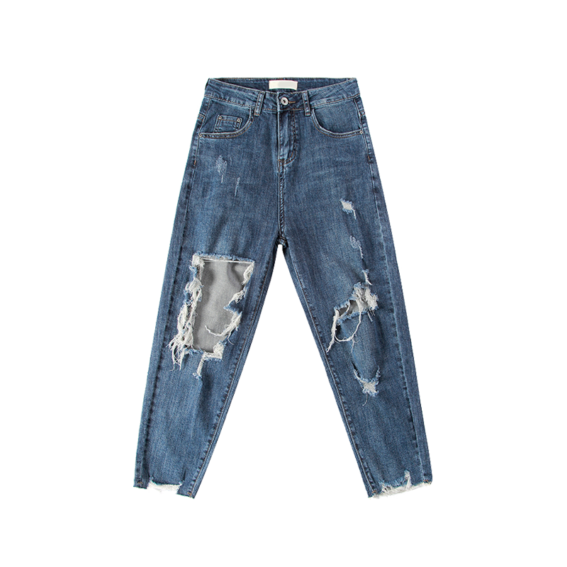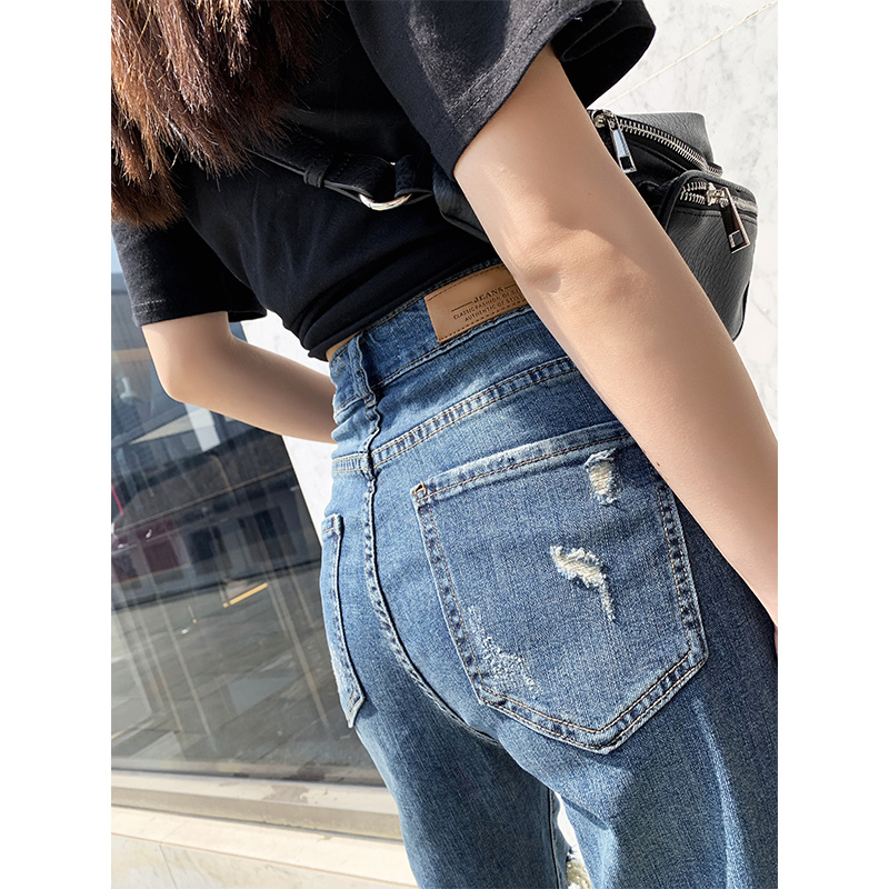 老爹裤 2024夏新款 子 女九分宽松高腰直筒裤 SJOG膝盖大破洞牛仔裤