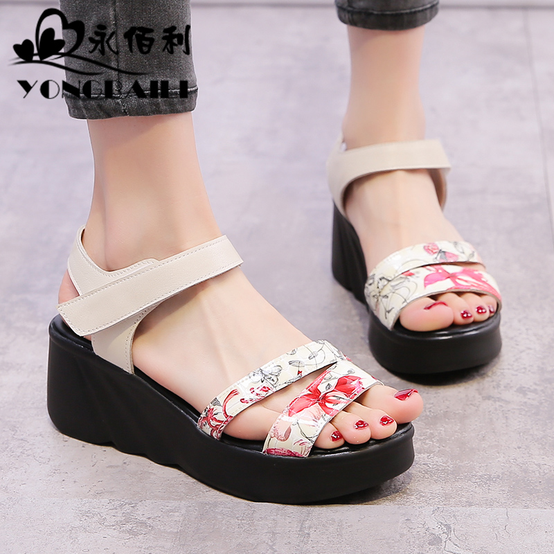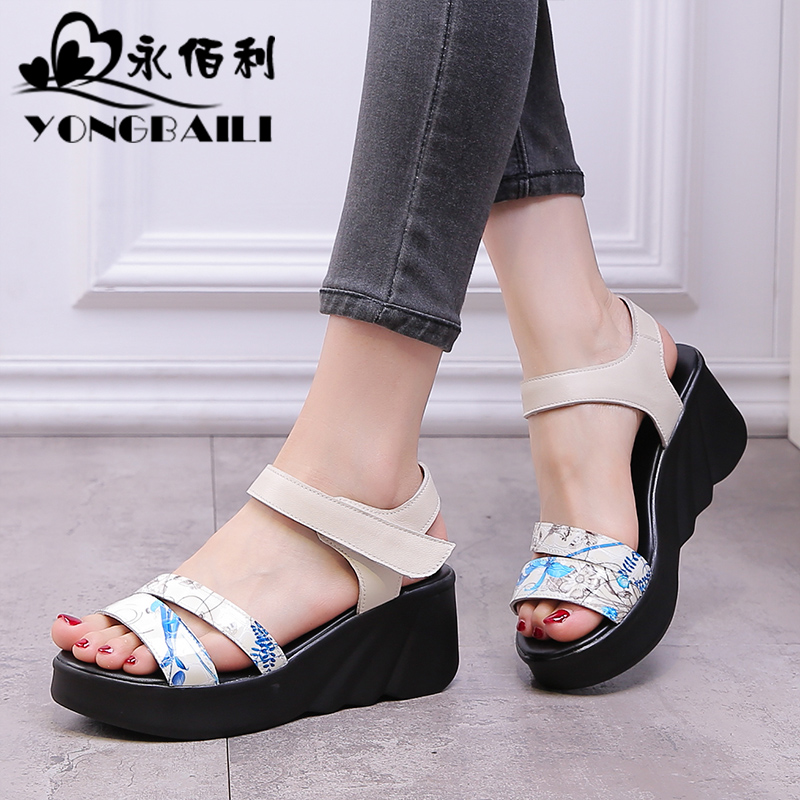 女松糕羊皮休闲女鞋 2025夏季 牛皮凉鞋 青花瓷坡跟高跟厚底皮鞋 新款