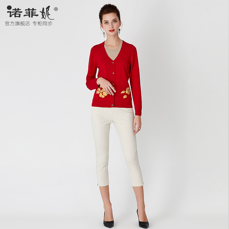 外搭妈妈薄款 专柜品牌红色真丝V领针织开衫 上衣毛衣 新款 2025秋装