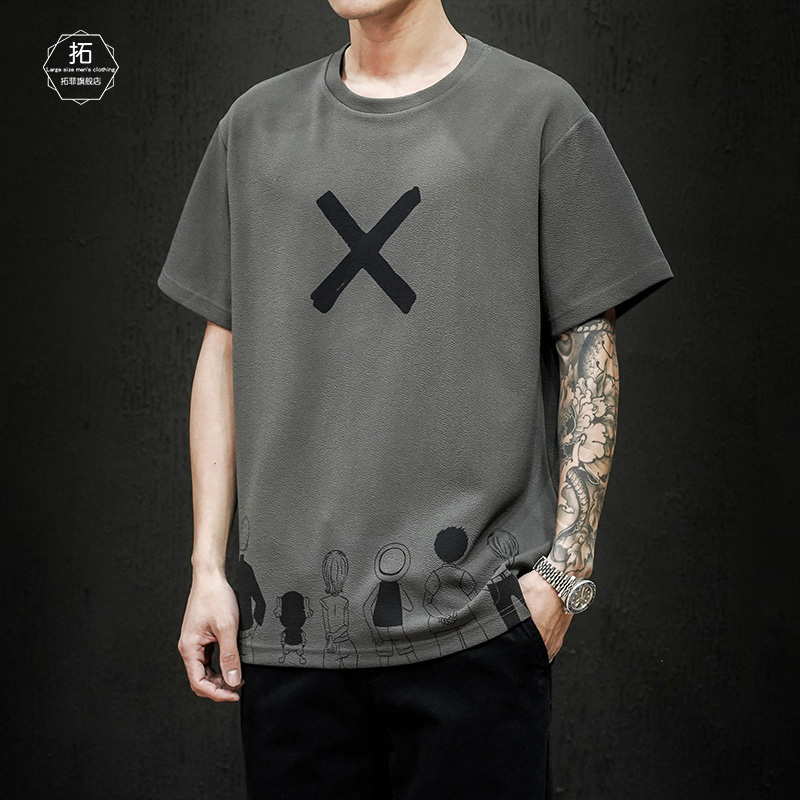 男潮牌潮流ins个性 体恤衫 交叉印花圆领半袖 薄款 衣服男夏季 t恤短袖