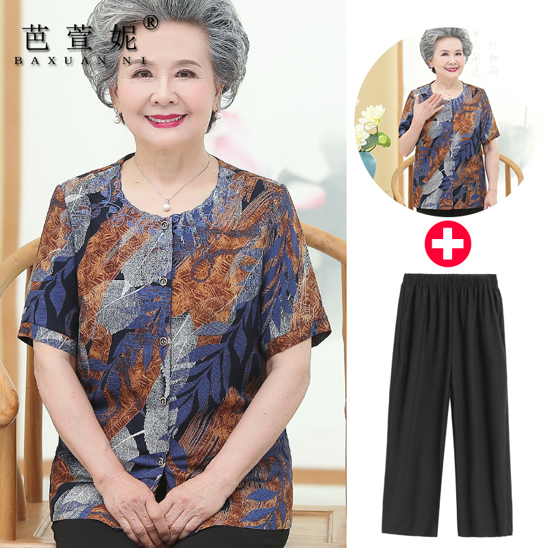 短袖 老人衣服胖妈妈装 衬衫 大码 纯棉t恤上衣 奶奶套装 老年人女夏装