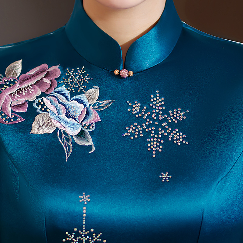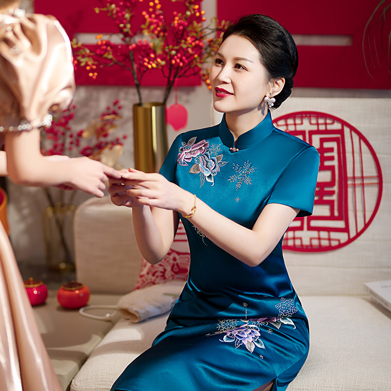 复古刺绣加厚旗袍高档醋酸缎亮面端庄气质婚礼妈妈宴会中长款 旗袍