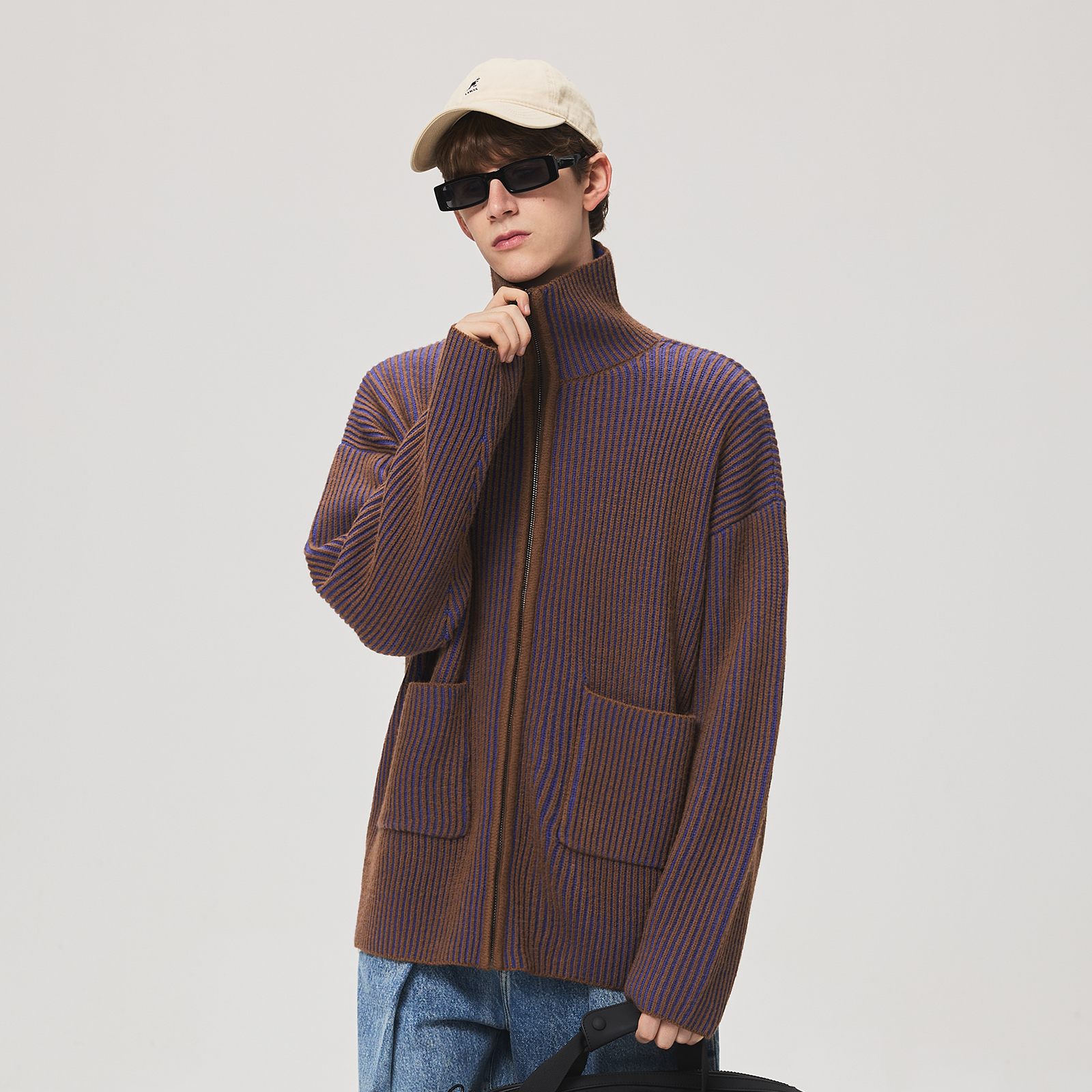 蓝色翻领毛衣 新款 阔色慵懒风灰色针织开衫 外套上衣女2025秋冬季