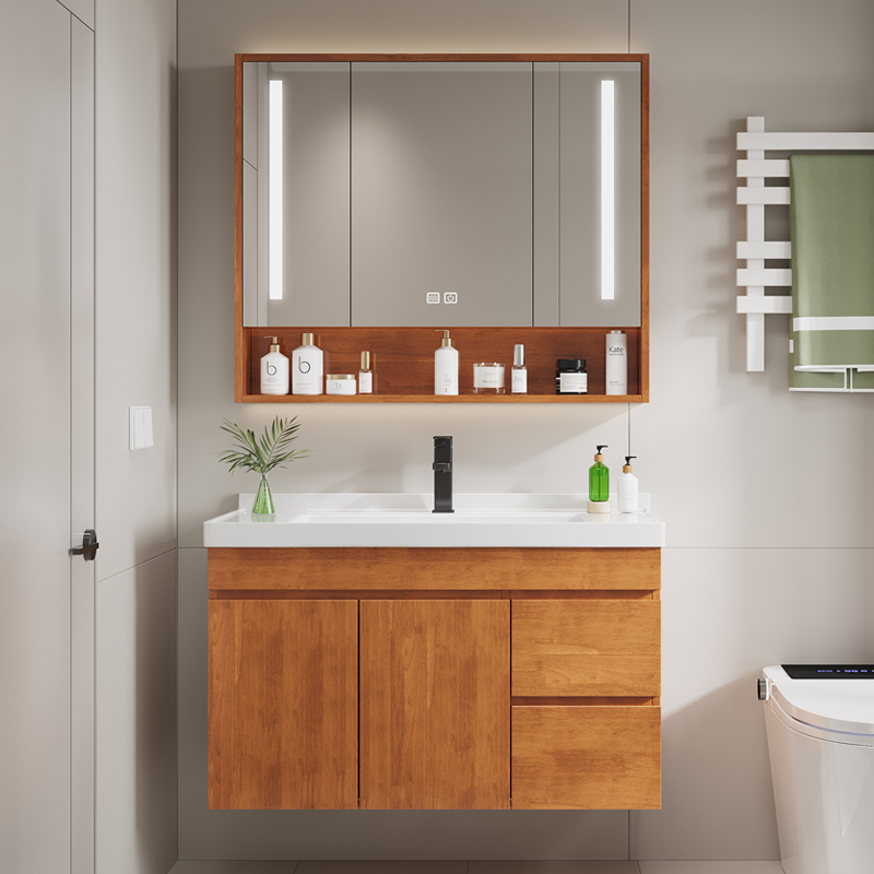 逸沁实木橡木浴室柜组合陶瓷一体盆洗脸盆洗手盆洗漱台盆镜柜喷漆