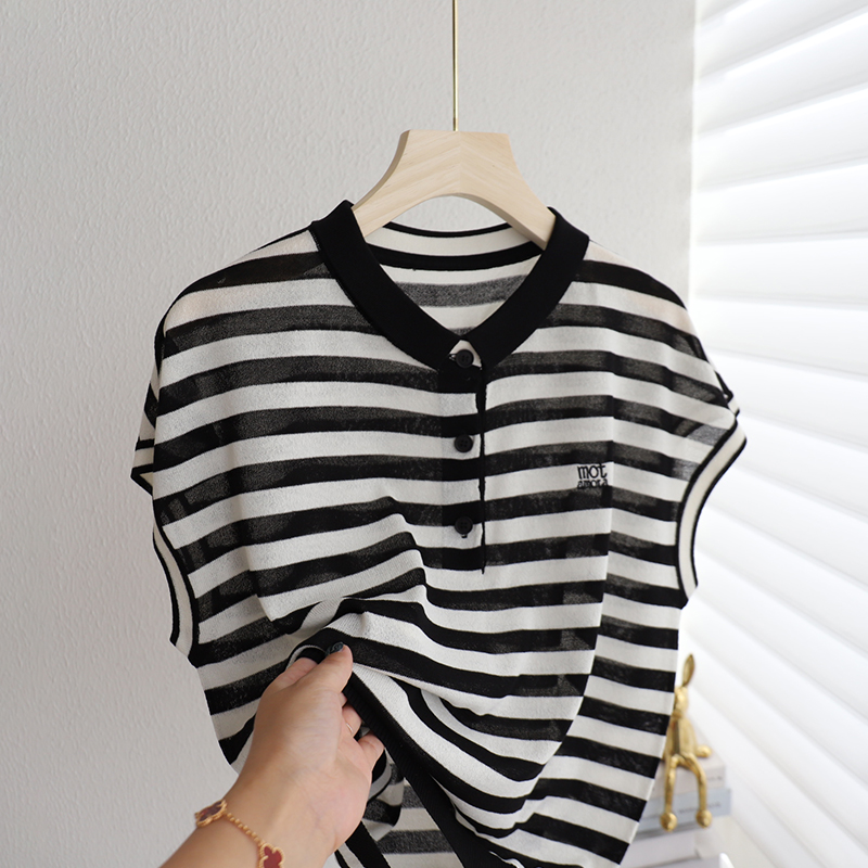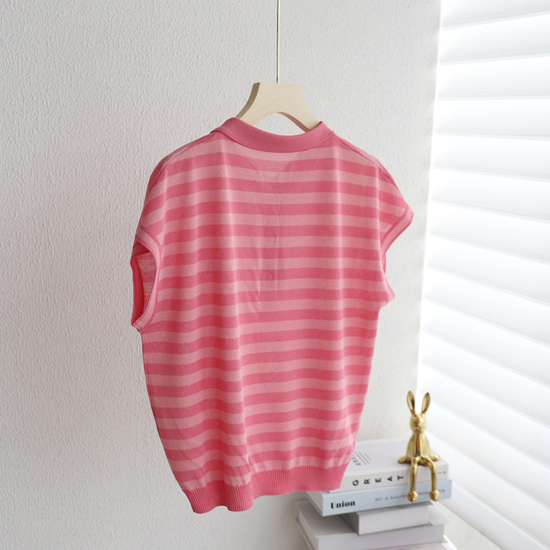 polo衫 新款 短款 薄款 上衣 t恤女莱赛尔天丝条纹翻领短袖 针织衫 夏季