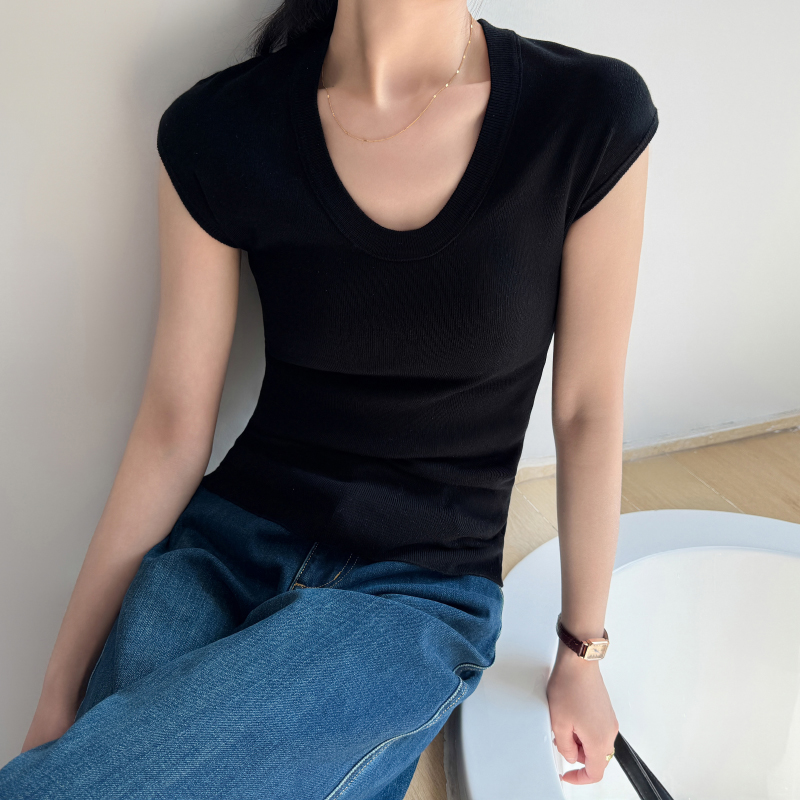 修身 夏季 气质纯色大圆领上衣 高级感天丝2025新款 灰色U领t恤女短袖