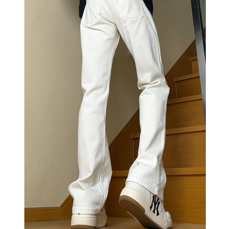 MOCO牛仔裤 摩安珂 摇滚洗磨莱卡棉弹力精裁高腰修长及地微喇裤