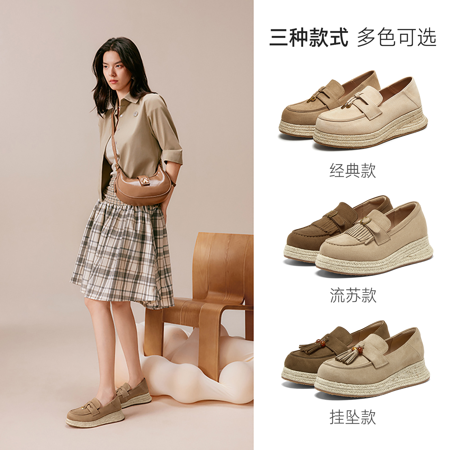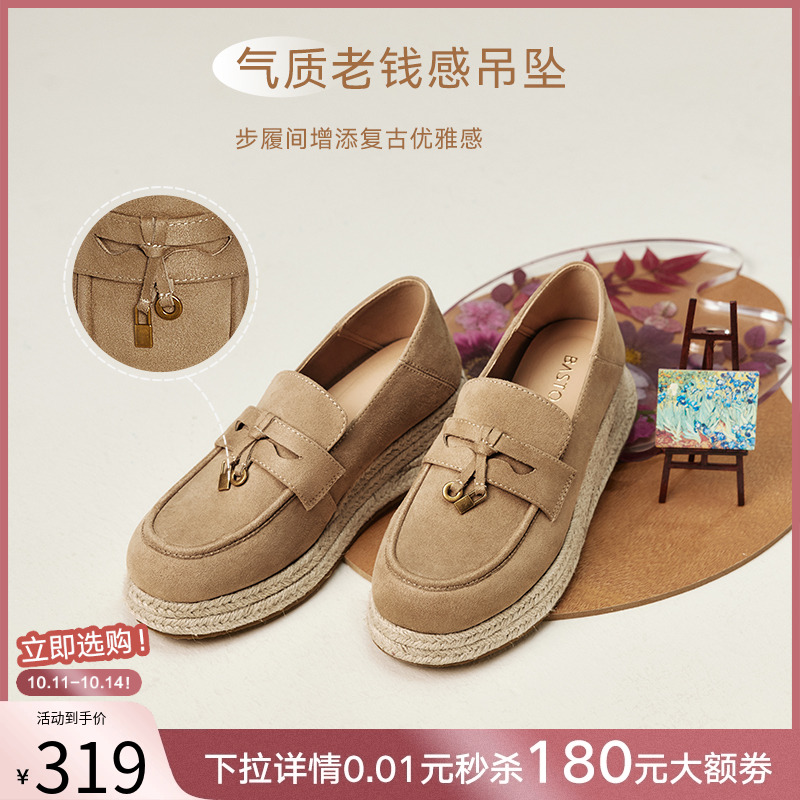 单鞋 百思图25秋新款 女松糕鞋 厚底乐福鞋 B0515CA5 一脚蹬草编渔夫鞋