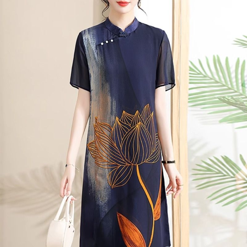 母亲节裙子大码 旗袍连衣裙中老年女国风雪纺短袖 2025新款 妈妈夏装