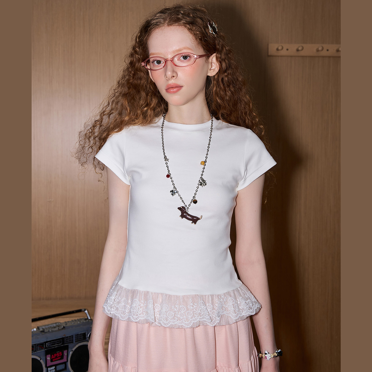 T恤甜美设计感 女式 coolhut拼接蕾丝简约圆领修身 花边2025夏季