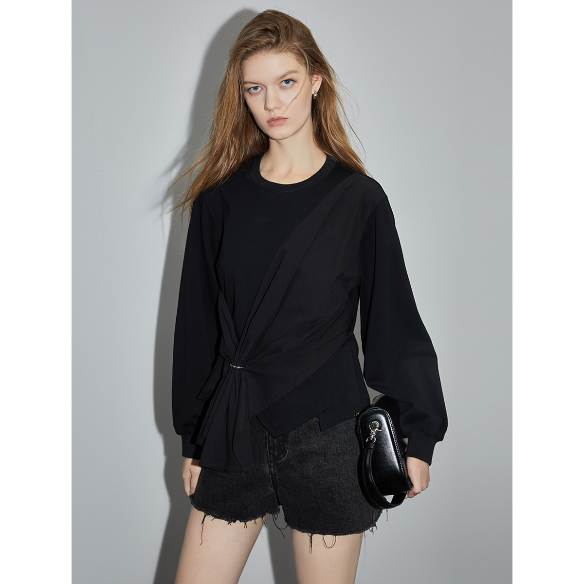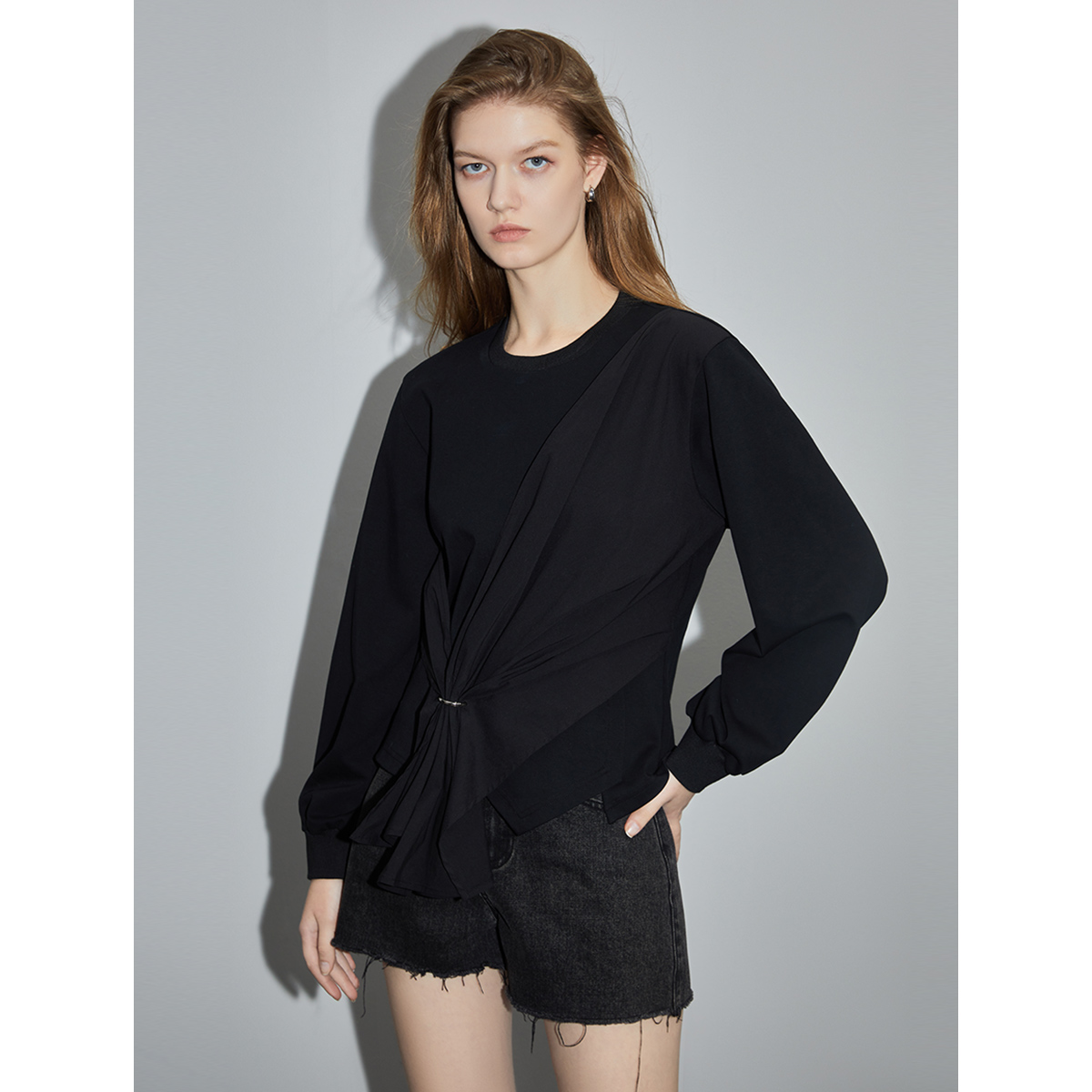 ELLE黑色设计感褶皱圆领卫衣女2025秋装 通勤风宽松显瘦上衣 新款