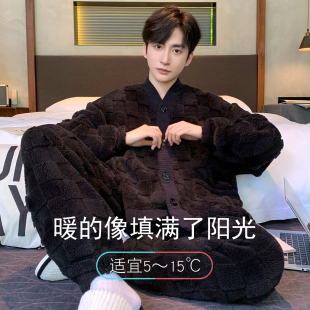 加绒加厚青少年可外穿法兰绒家居服冬天套装 珊瑚绒睡衣男士 秋冬季