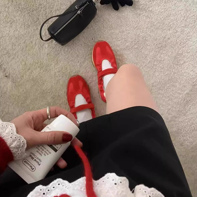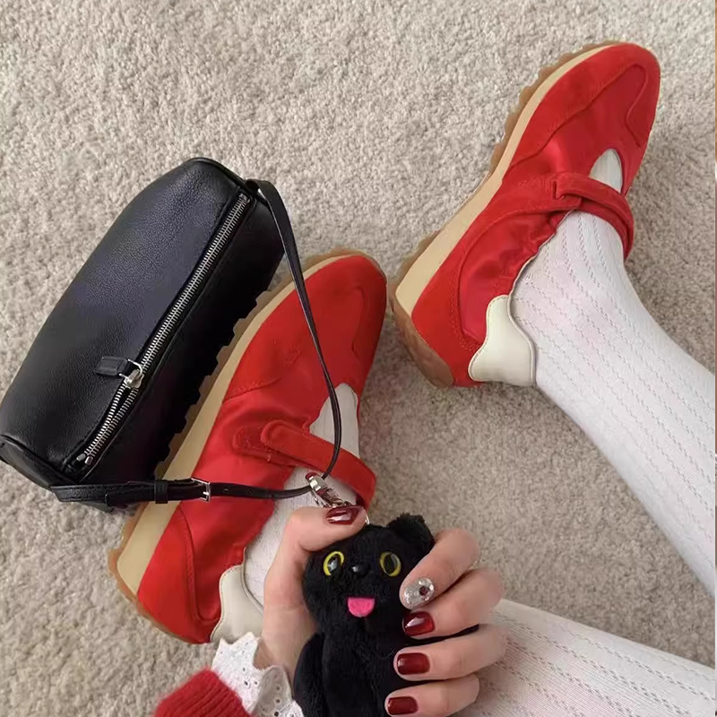 平底休闲运动鞋 红色复古单鞋 玛丽珍芭蕾风德训鞋 新款 女2025春夏季