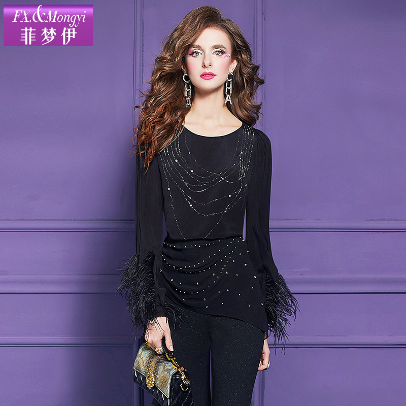 气质上衣潮 别致独特时尚 菲梦伊原创设计流苏边钉珠黑色衬衫 女秋季