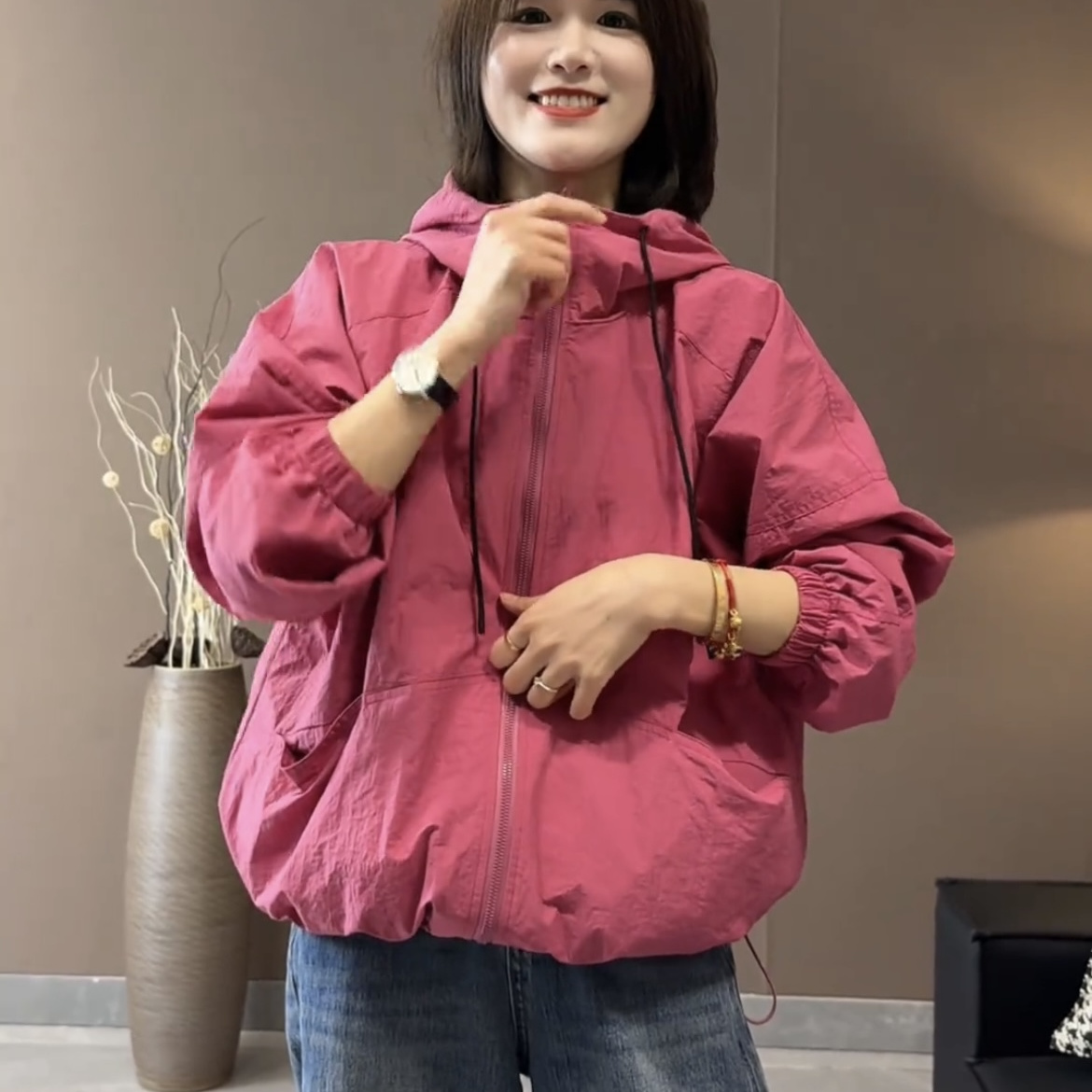 小个子休闲玫粉色冲锋衣连帽外套女2025超火新款 高级夹克上衣