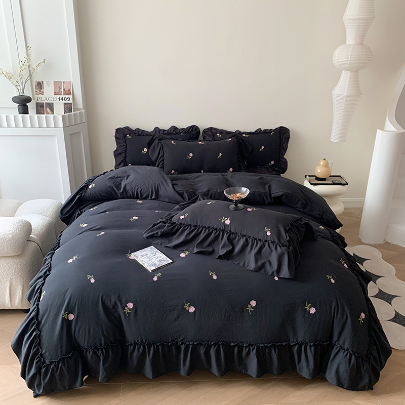 花边水洗棉床品四件套被套床单床笠柔 浪漫黑玫瑰大款 春上新 法式