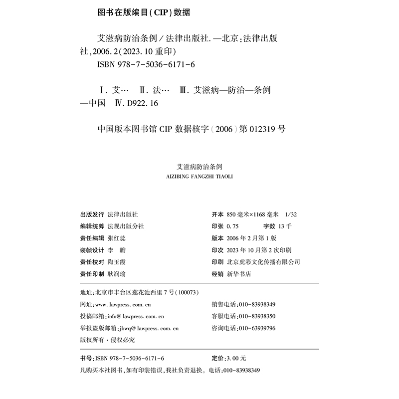 新书 律出版 艾滋病防治条例 本条例自2006年3月1日起施行 社9787503661716 32开 正版