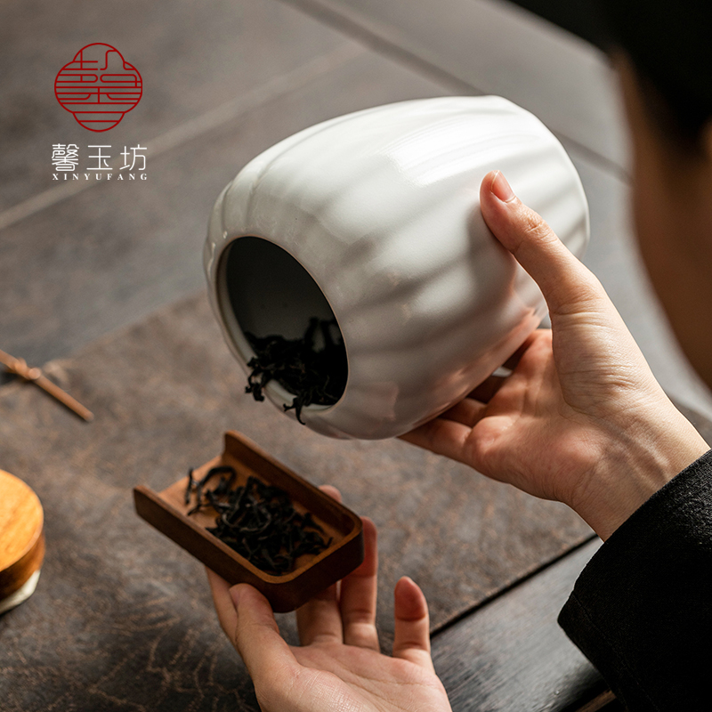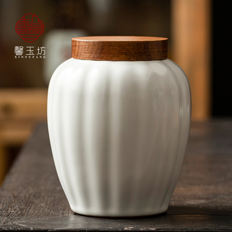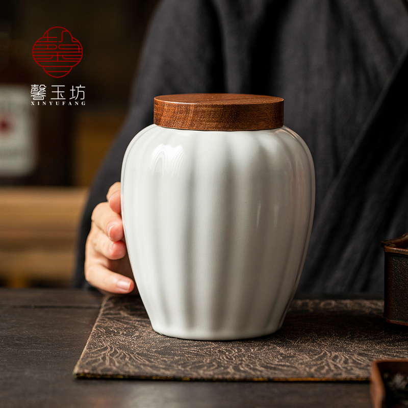 汝窑月白陶瓷茶叶罐实木盖密封罐散茶存储白茶普洱茶绿茶红茶空罐