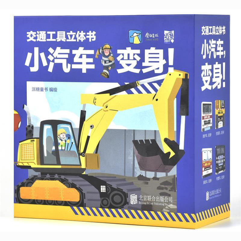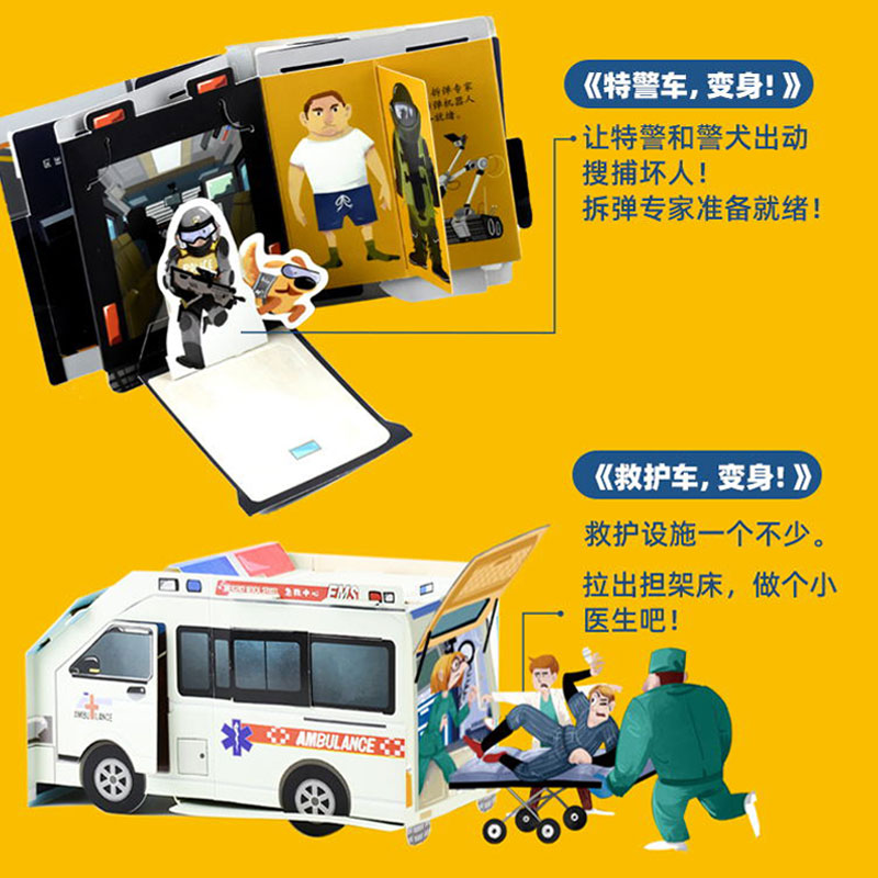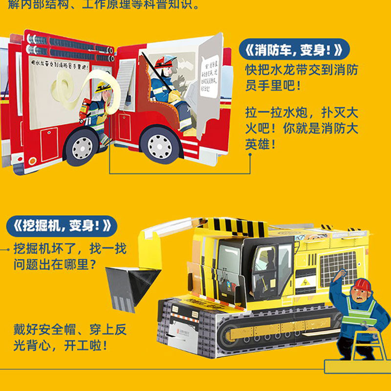 搭建4种车型幼儿早教益智游戏书籍翻翻书赠汽车纸膜 互动机关立体书儿童3d立体书汽车可阅读拼装 交通工具立体书小汽车变身全4册