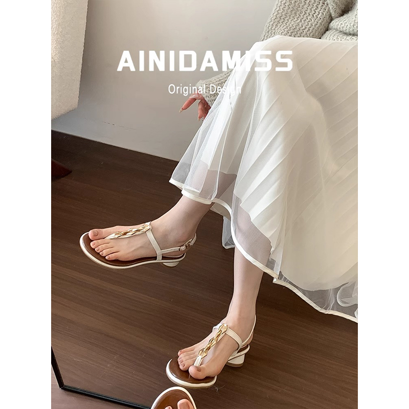 版 沙滩度假罗马鞋 复古法式 女外穿羊皮2025新款 夹趾粗跟凉鞋 夏季