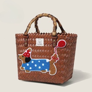澜泽诗普手工卡通编织菜篮子可爱刺绣小狗编织百搭手提包收纳包