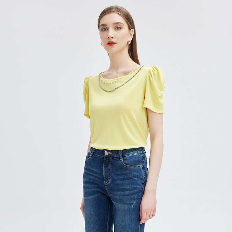 马天奴女装 短袖 春夏新款 T恤泡泡袖 气质链条上衣 黄色短款 专柜正品
