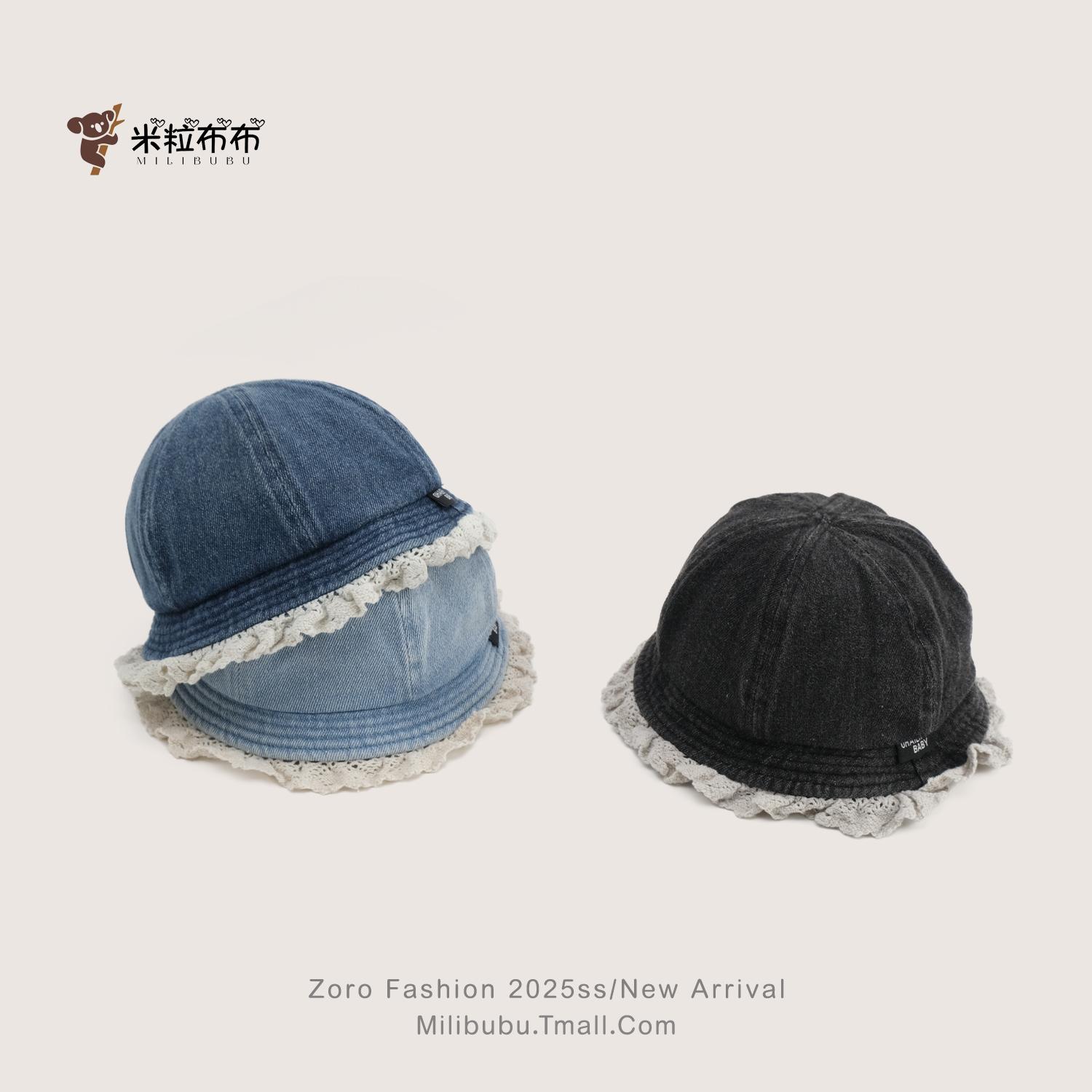 女宝宝帽子春秋季 公主水洗牛仔渔夫帽儿童遮阳帽宫廷蕾丝盆帽 韩版