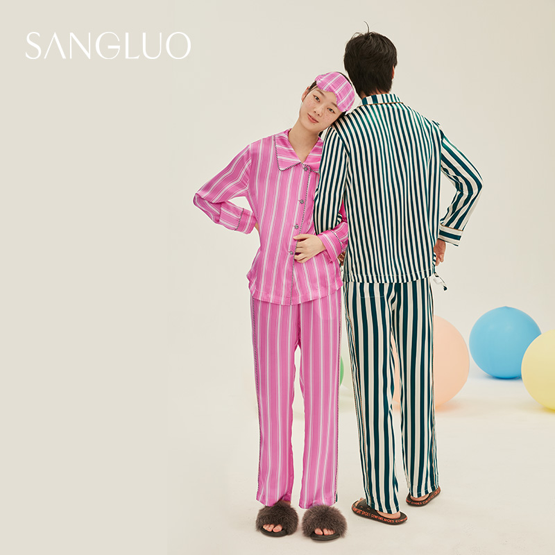 SANGLUO真丝情侣睡衣粉绿竖条纹100%桑蚕丝居家套装 男女可外穿