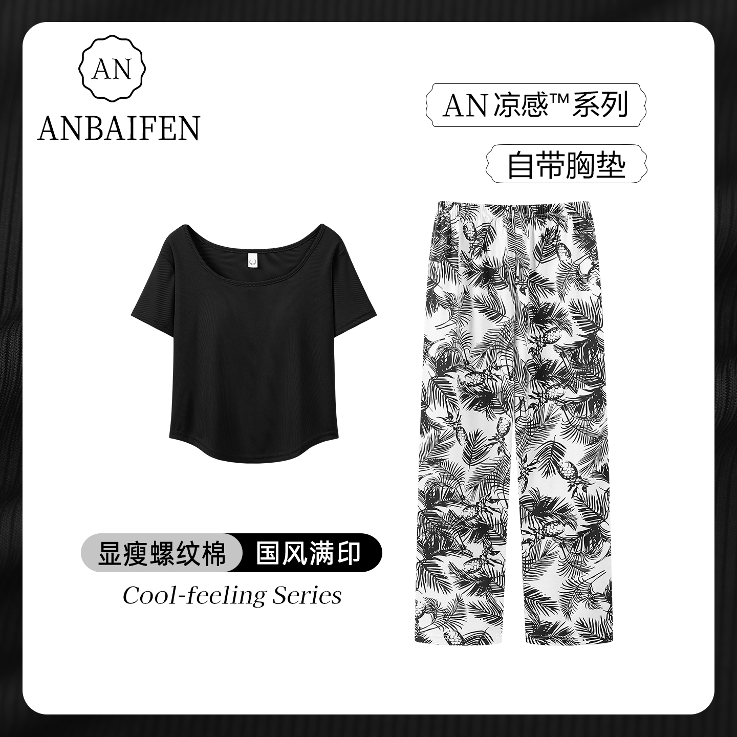 薄款 2025新款 短袖 套装 可外穿家居服 长裤 猫人纯棉带胸垫睡衣女夏季