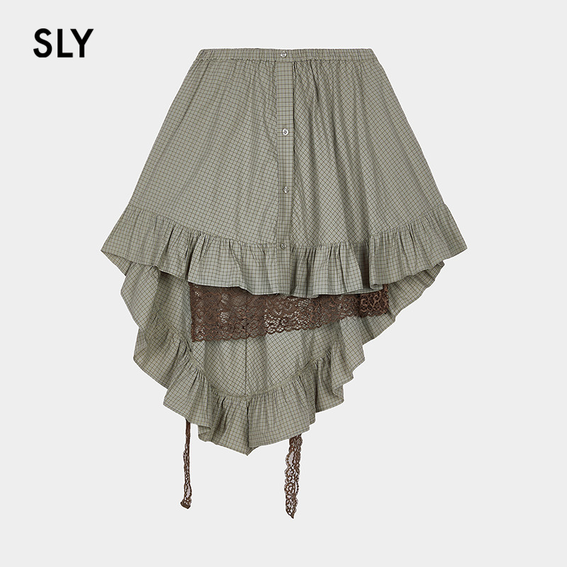 SLY2025早秋新品 0031 优雅复古格子蕾丝不规则荷叶边半裙038IAU31