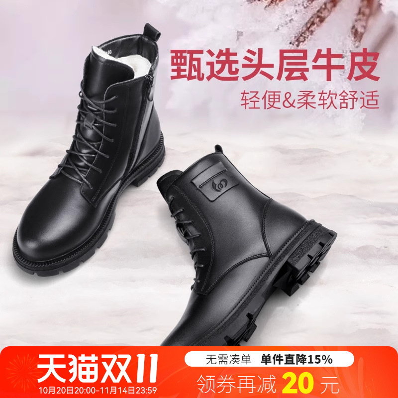 周雨彤推荐 百丽黑桃少女靴厚底马丁靴真皮加绒短靴子B8K1DDD4预