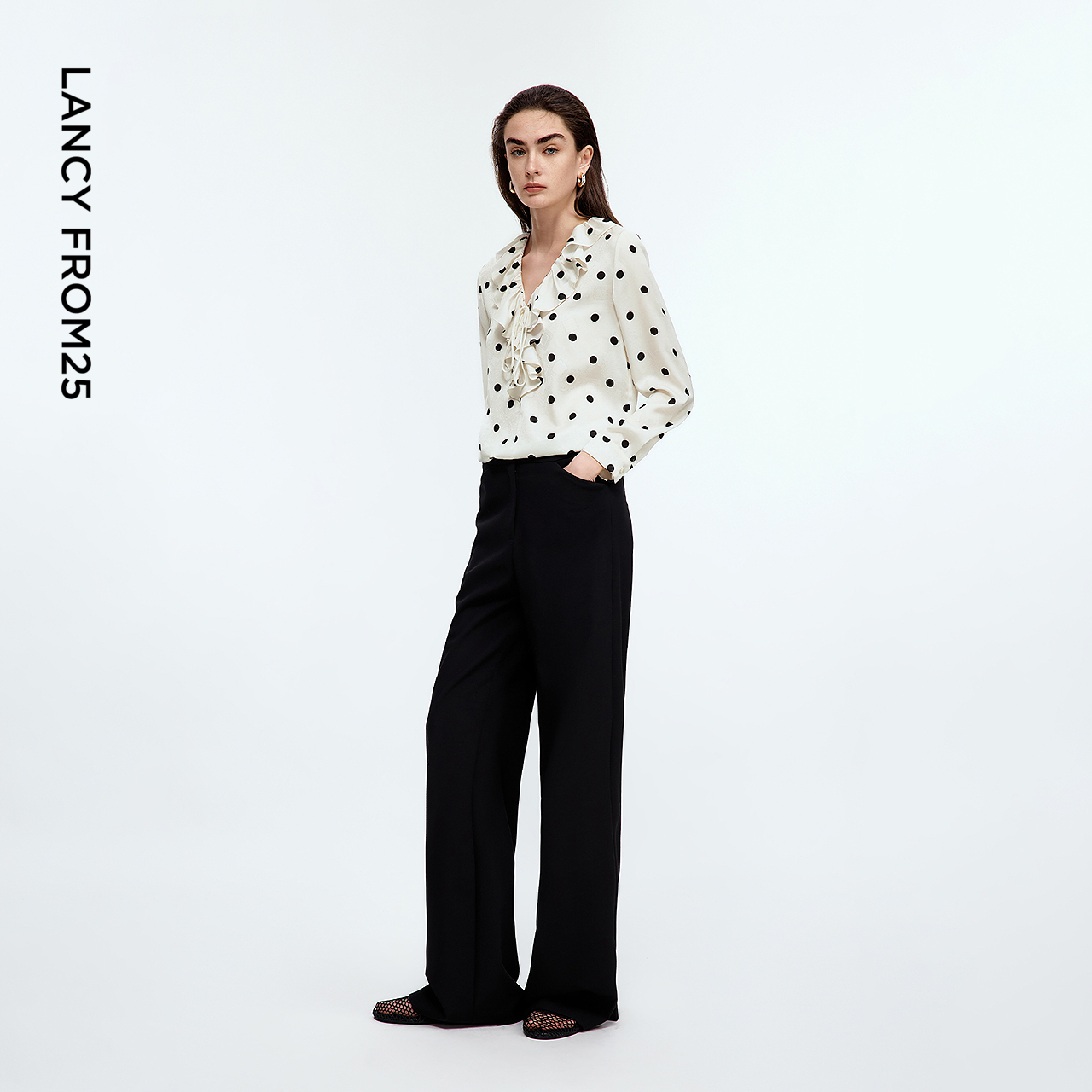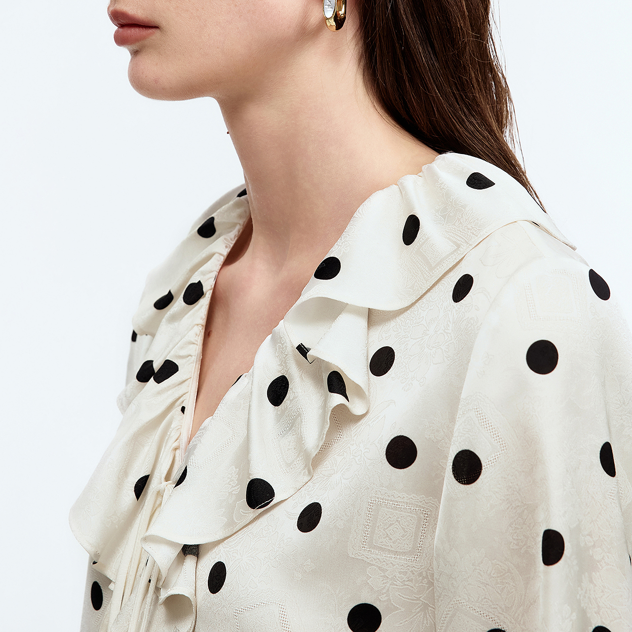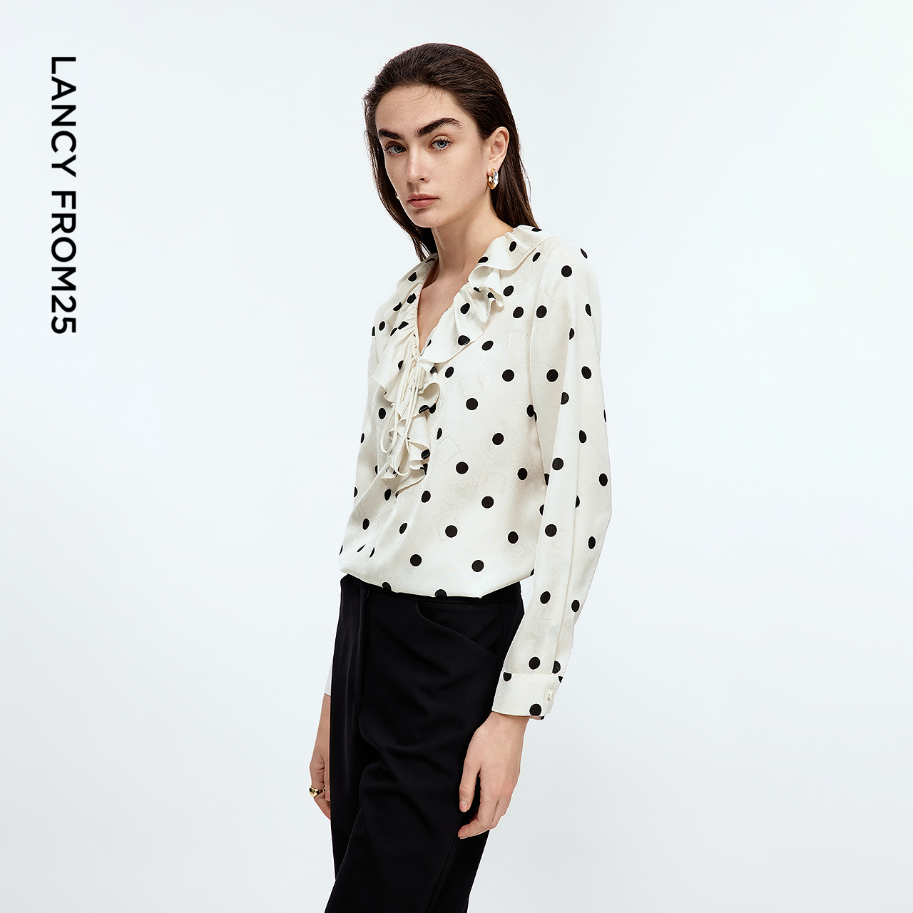 女 新款 朗姿波点荷叶边v领提花衬衫 高级感气质通勤上衣2025年秋季
