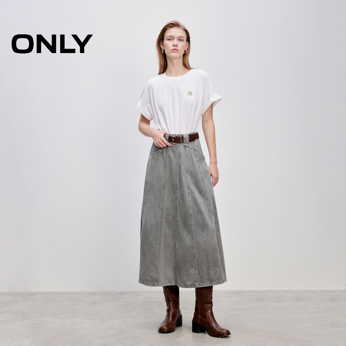 T恤牛仔裙拼接假两件A字伞裙长裙连衣裙女 时尚 ONLY2025秋季 新款