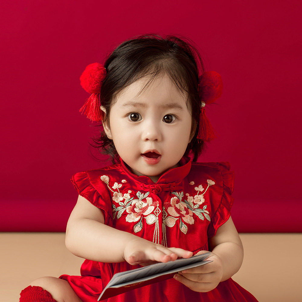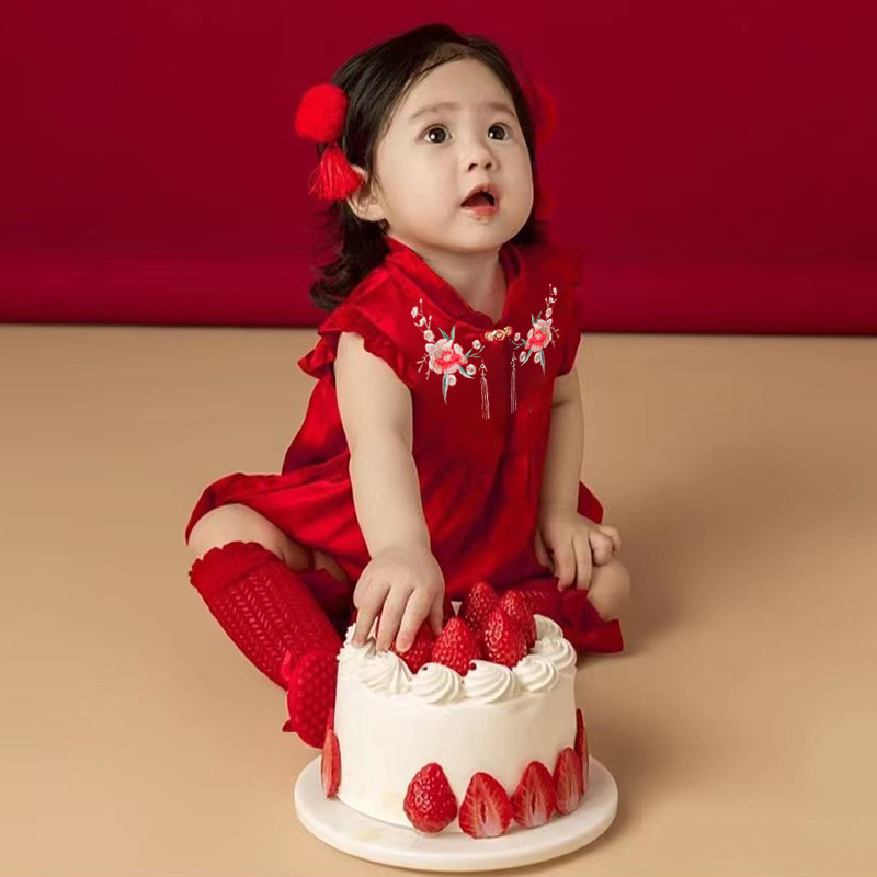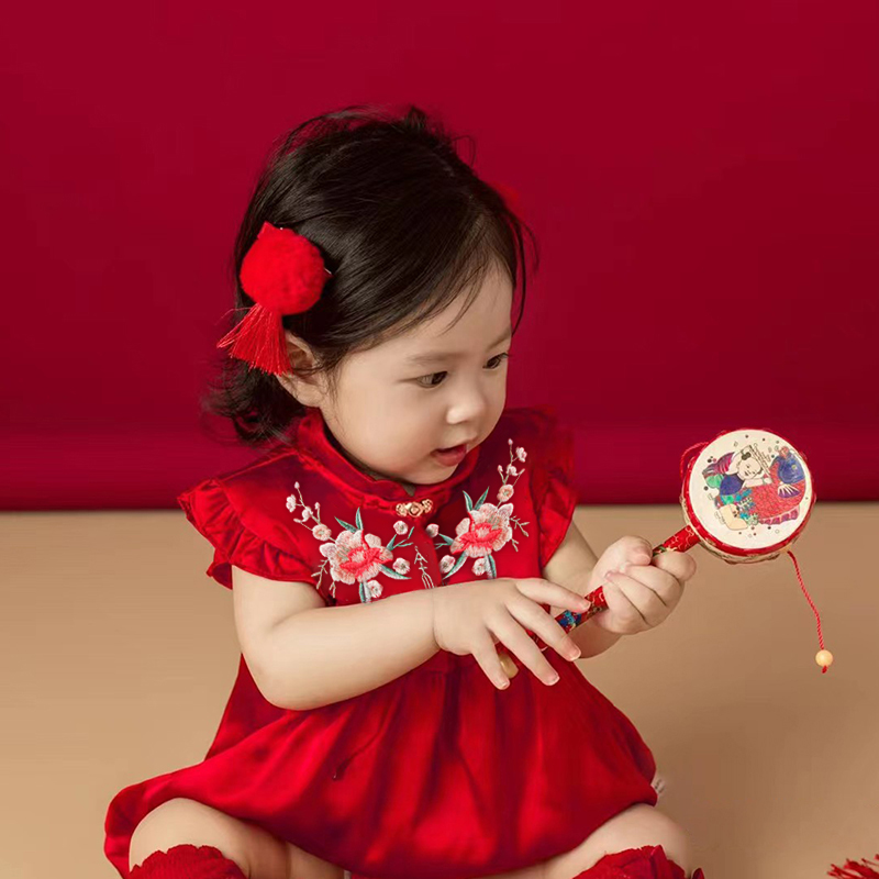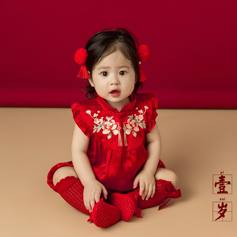 春夏周岁女宝礼服新中式 国风红色喜气包屁衣满月百天生日抓周唐装