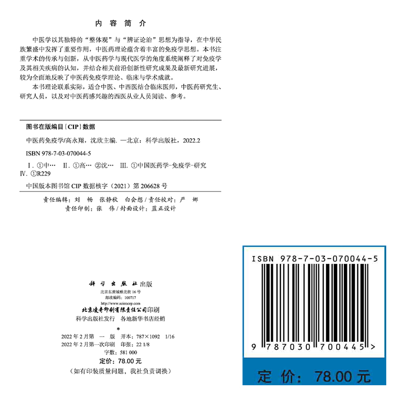 现货 科学出版 中医药免疫学 沈欣 社9787030700445 高永翔 正版