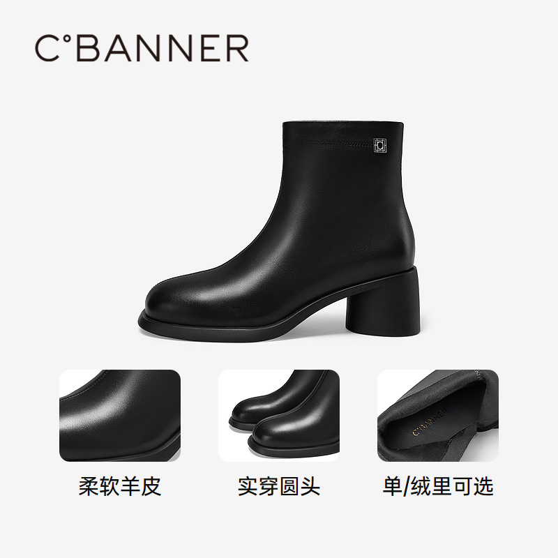 气质显瘦通勤小短靴保暖舒适 百搭冬季 千百度粗高跟羊皮时装 靴女款