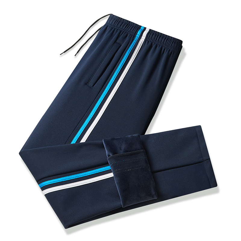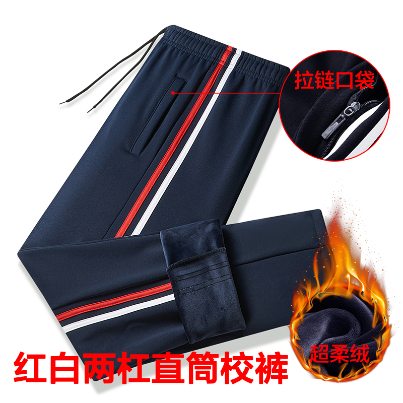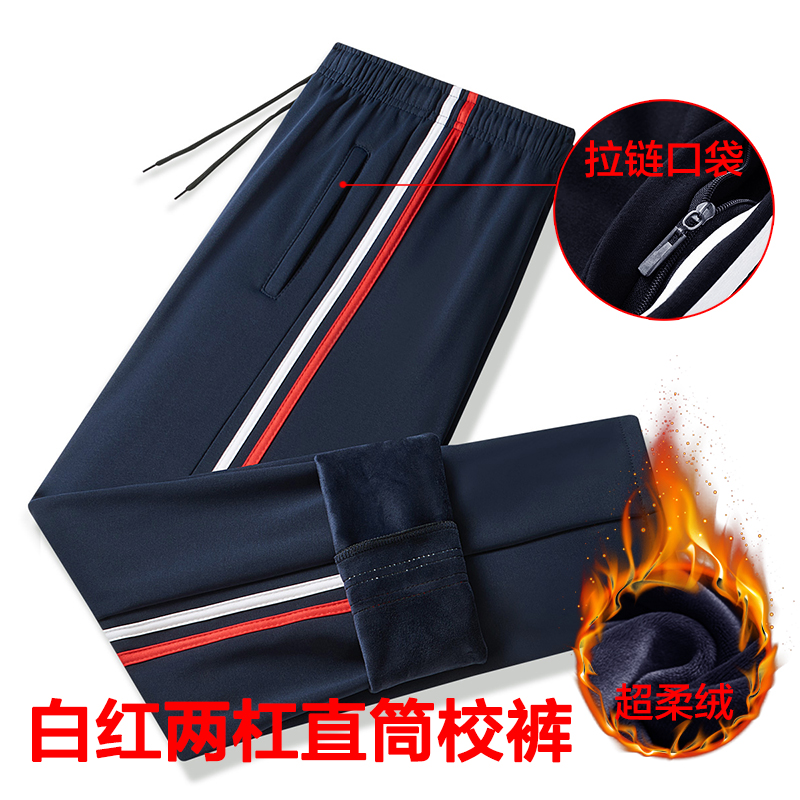 男女学生校服裤 冬加绒保暖藏青色蓝白条纹两条杠拉链口袋直筒长裤